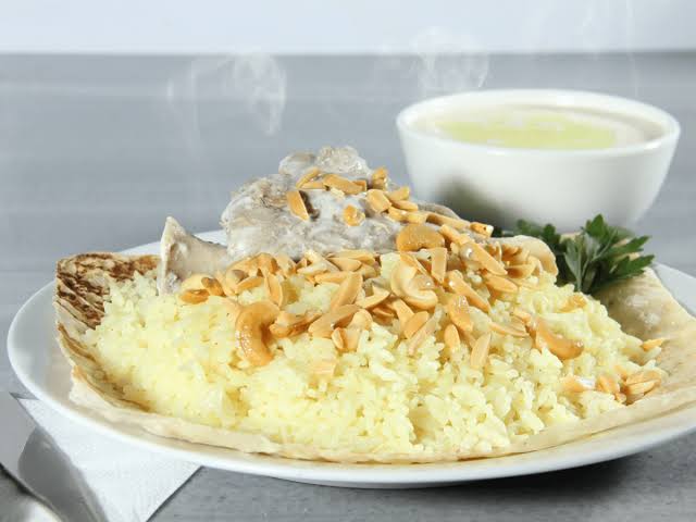 أرز متبل مع بهارات الكبسة، يقدم مع قطع اللحم